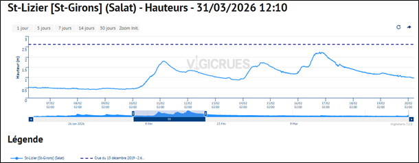 La période de retour de cette crue du Salat à Saint-Lizier et à Roquefort-sur-Garonne est estimée entre 2 à 5 ans. A titre de comparaison, la crue de janvier 2022 relève environ d’une période de retour de 30 ans à St Lizier (3,20m à l’échelle) et d’une cinquante ans à Roquefort-sur-Garonne.